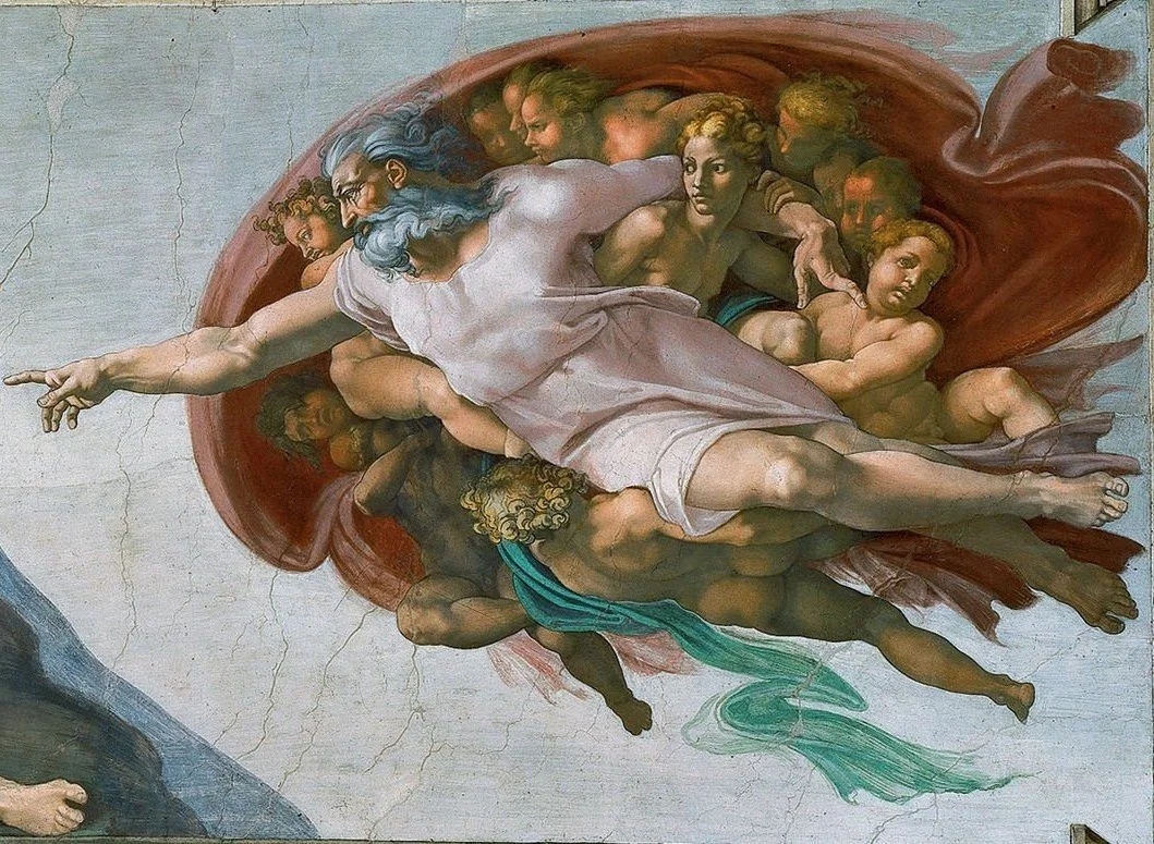 One of the largest painting projects ever—some 5,000 square feet, with more than 300 figures. It was no less than “The History of the World According to Michelangelo,” from the Creation to the coming of Christ. And there in the center was the central act of creation—God reaching out to pass the spark of life to his greatest work, Man.